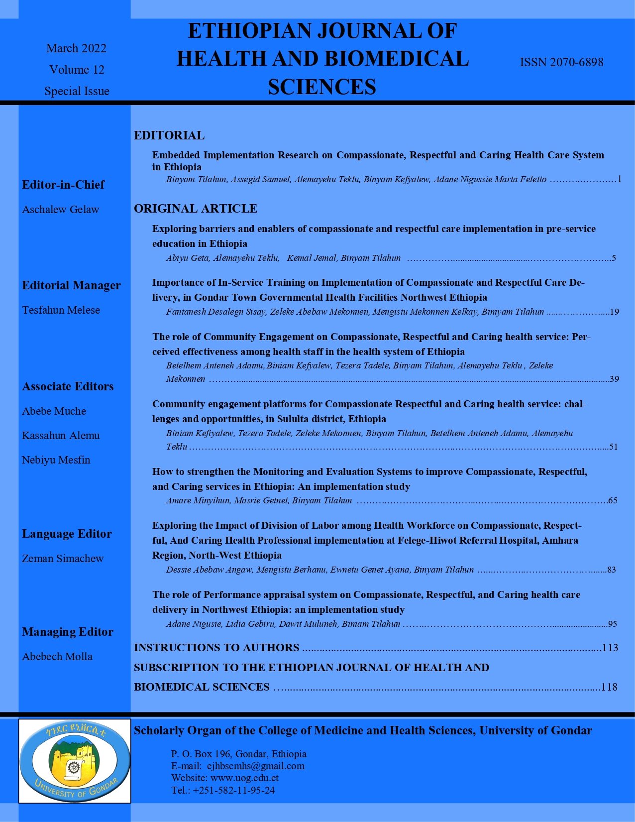 Kefiyalew B, Tadele T, Mekonnen Z, Tilahun B, Anteneh B, Teklu A. Community engagement platforms for Compassionate Respectful and Caring health service: challenges and opportunities, in Sululta district, Ethiopia. Ethiop J Health Biomed Sci [Internet]. 2022 Apr. 11 [cited 2025 Oct. 13];12(1):51-63. Available from: https://ejhbs.uog.edu.et/index.php/EJHBS/article/view/324